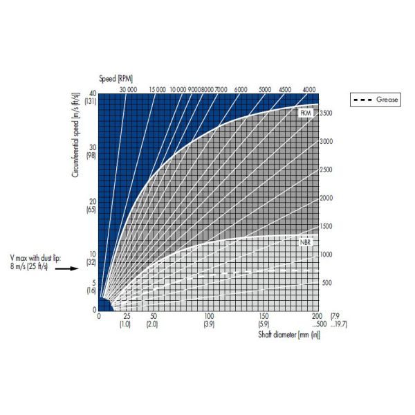 Permissible circumferential speed for oil seals made from materials NBR(70) and FKM(75) for the sealing of motor oil SAE 20. The max speed for seals with dust lip: V=8 m/s.